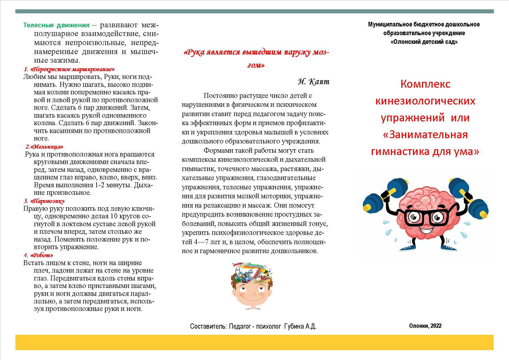 Буклет для педагогов. Комплекс кинезиологических упражнений или «Занимательная гимнастика для ума»